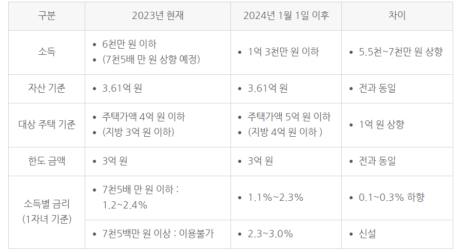 조건 완화 중 가장 대표적인 것이 소득 요건입니다. 과거와 비교해 금액이 약 2배 정도 증가한 것입니다. 사실 7천만 원 이하 조건의 맞벌이 가구가 어려운 경우가 많았는데, 1억 3천만 원으로 올리면서 대출 혜택을 보는 가구의 폭이 커질 것으로 전망됩니다.