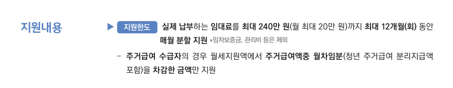 실제 납부하는 월세 범위에서 매월 20만원씩 최대 1년을 기준으로 240만원까지 본인 계좌로 현금 입금됩니다. 지급일은 매월 25일 기준이고 해당일이 공휴일인 경우 그 전날 지급을 원칙으로 합니다.
