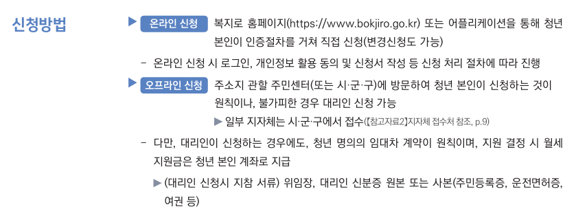 청년 본인이 신청하면 되며 온라인의 경우 복지로 누리집에서 본인 인증절차를 거쳐 직접 신청이 가능합니다.