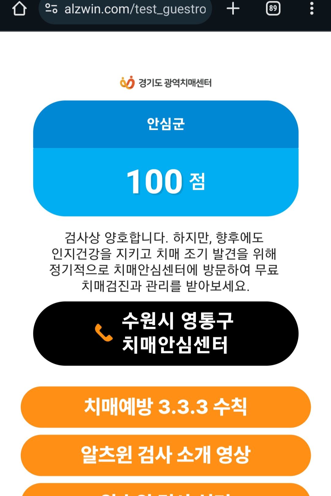 검사 완료하였으면 자동으로 AI가 검사 결과를 채점합니다. 만약 낮은 점수를 받아 고위험군 판정을 받으셨다면 경기도광역치매센터에 결과가 공유되어 전화 방문 안내를 도와드린다고 합니다.
